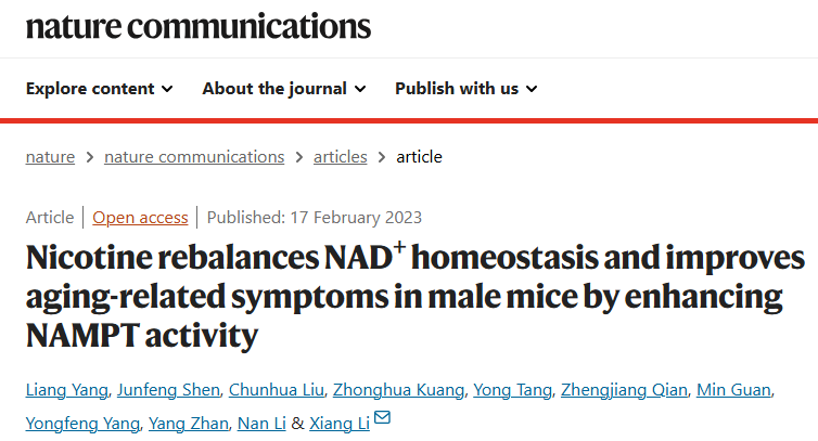 2023年2月17日,李翔研究员团队在Nature Communications 期刊在线发表题为“Nicotine rebalances NAD+ homeostasis and improves aging-related symptoms in male mice by enhancing NAMPT activity” 的研究论文。