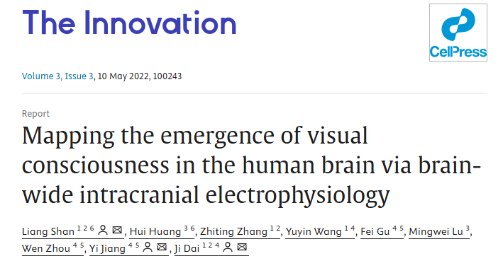 2022年4月20日,戴辑副研究员团队联合中国科学院心理研究所、南昌大学附属第二医院团队,在The Innovation杂志在线发表了题为“Mapping the emergence of visual consciousness in the human brain via brain-wide intracranial electrophysiology” 的文章,从感知觉层面,揭示了视觉感知从无意识到意识下再到意识上涌现过程中,大脑各区域神经信号的动态变化特征,从而大大增进了对意识形成的神经生物学基础的理解。