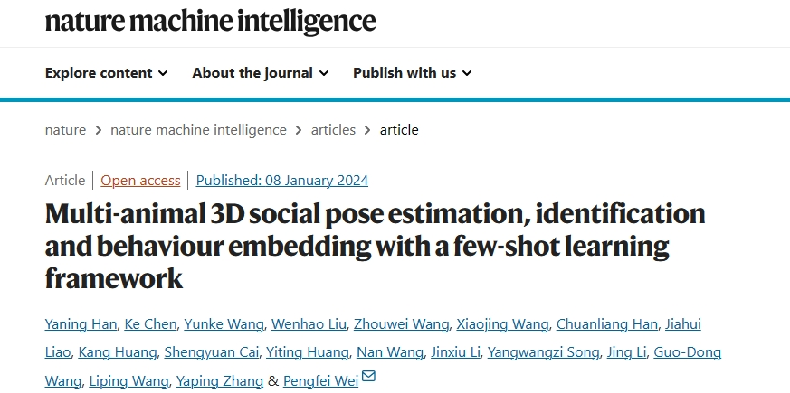 2024年1月8日,蔚鹏飞研究员团队在Nature Machine Intelligence 期刊发表了题为“Multi-animal 3D social pose estimation, identification, and behavior embedding with a few-shot learning framework” 的研究论文,发布了神经环路研究领域一项突破性应用技术:针对社交行为研究的小样本学习计算框架模型Social Behavior Atlas。