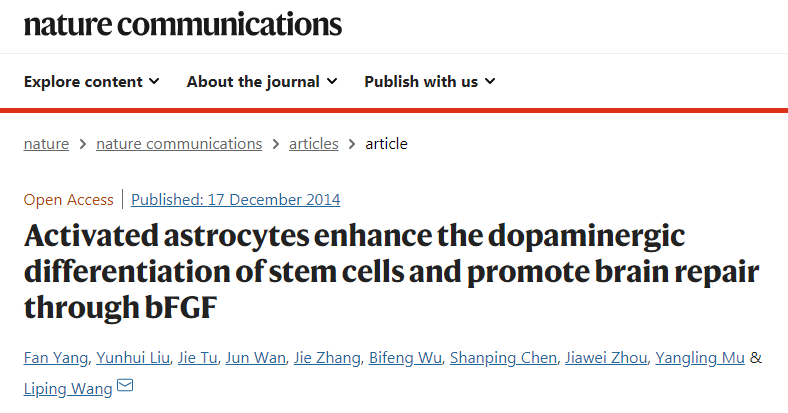 2014年12月17日,王立平研究员和杨帆研究员团队,在Nature Communications在线发表题为“Activated astrocytes enhance the dopaminergic differentiation of stem cells and promote brain repair through bFGF” 的研究文章。