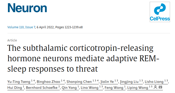 2022年1月22日,王立平研究员团队在Neuron杂志在线发表了题为“The subthalamic corticotropin-releasing hormone neurons mediate adaptive REM sleep responses to threat” 的研究论文,首次揭示了调控快速眼动睡眠与本能防御行为的“共享”神经环路,此大脑的“节能”模式的建立可能在进化过程中因适应环境的挑战而得到了发展和强化,此“共享”环路的发现揭示了快速眼动睡眠具有潜在“防御天敌”的功能。
