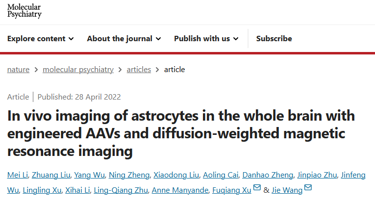 2022年4月28日,徐富强研究员团队在Molecular Psychiatry杂志上发表题为“In vivo Imaging of Astrocytes in the Whole Brain with Engineered AAVs and Diffusion Weighted Magnetic Resonance Imaging” 的研究成果。自2016年起,团队在徐富强研究员和王杰研究员的带领下,联合磁共振成像与病毒基因改造技术率先提出一种新型基因编码生物磁共振成像技术,逐步实现神经元网络(Neuroimage, 2019; Human Brain Mapping, 2021)和星形胶质细胞(Molecular Psychiatry, 2022)在体水平的无创检测。本研究中,团队基于基因编码生物磁共振成像技术,首次建立了一种在体无创全脑检测星形胶质细胞的新技术。