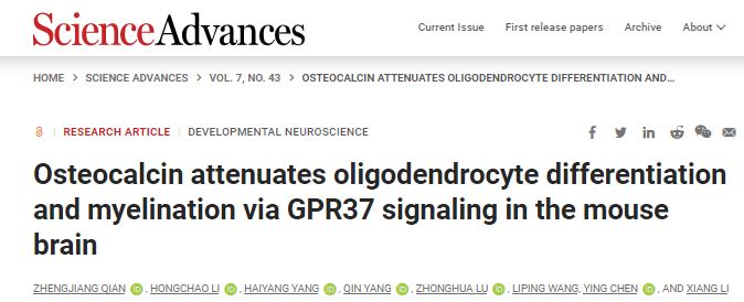 2021年10月22日,由李翔研究员团队领导,联合厦门大学陈颖教授团队,在Science Advances 在线发表题为“Osteocalcin attenuates oligodendrocyte differentiation and myelination via GPR37 signaling in the mouse brain” 的研究论文。