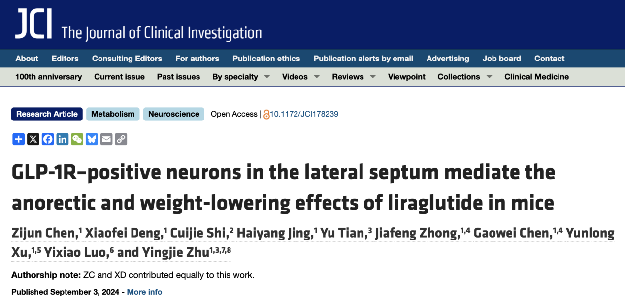 2024年9月3日,朱英杰研究员团队在Journal of Clinical Investigation期刊上发表了题为“GLP-1R–positive neurons in the lateral septum mediate the anorectic and weight-lowering effects of liraglutide in mice” 的研究论文。
