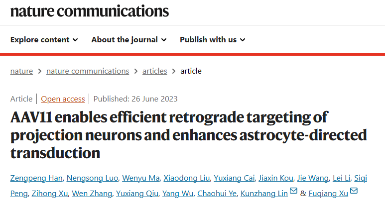 2023年6月26日,徐富强/林坤章团队在Nature Communications杂志在线发表了题为“AAV11 enables efficient retrograde targeting of projection neurons and enhances astrocyte-directed transduction” 的研究论文。
