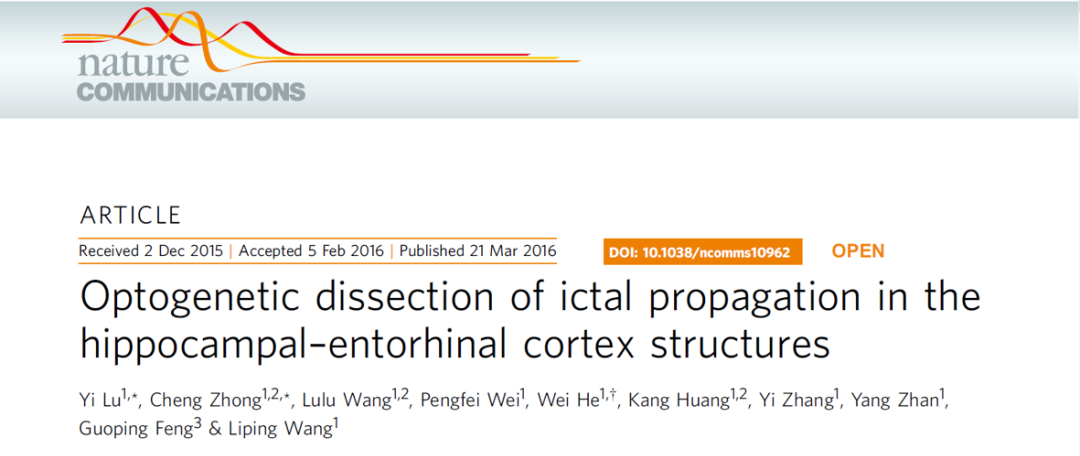 2016年3月21日,王立平研究员和鲁艺研究员团队共同在Nature Communications期刊上发表了题为“Optogenetic dissection of ictal propagation in the hippocampal-entorhinal cortex structures” 的研究论文。