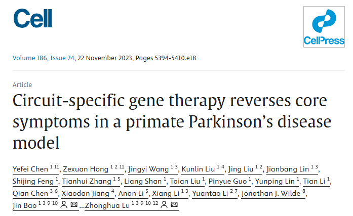 2023年11月2日,路中华研究员、戴辑副研究员和鲍进研究员团队在Cell 期刊在线发表题为“Circuit-specific gene therapy reverses core symptoms in a primate Parkinson’s disease model” 的研究论文。
