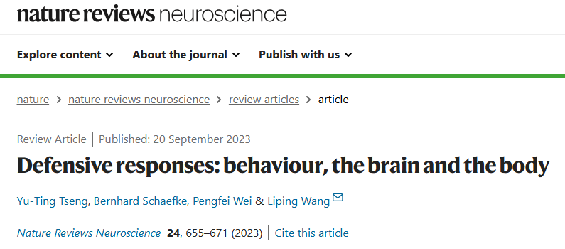 2023年9月20日,曾渝婷副研究员和王立平研究员团队在Nature Reviews Neuroscience期刊在线发表题为“Defensive responses: behaviour, the brain and the body” 的综述。