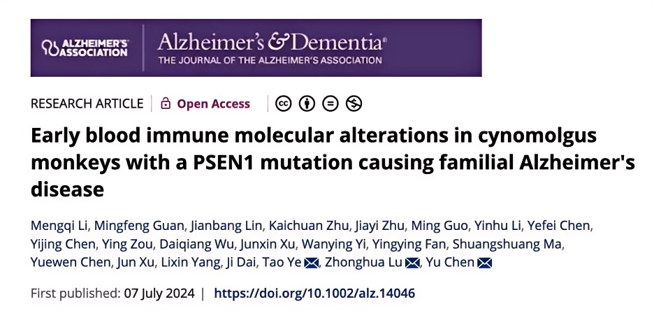 2024年7月7日,陈宇/路中华/叶涛团队在临床神经病学领域国际知名期刊Alzheimer"s & Dementia发表题为“Early blood immune molecular alterations in cynomolgus monkeys with a PSEN1 mutation causing familial Alzheimer’s disease” 的研究论文,报道了首个精准模拟阿尔茨海默病致病基因突变的基因编辑猕猴模型(PSEN1突变食蟹猴)。
