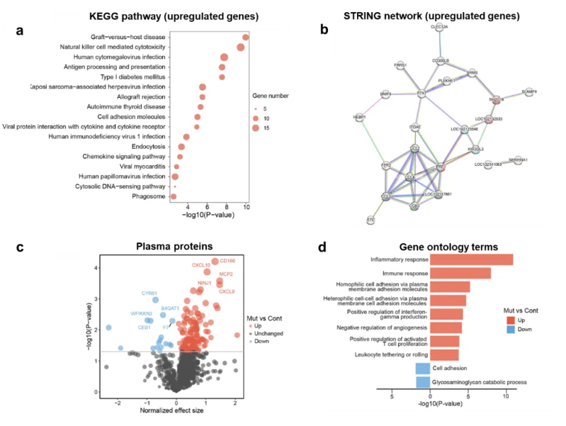 为进一步揭示AD发展进程中的潜在早期分子信号改变,从而为解析早期疾病发生机制、发展早期分子诊断方法提供新的线索,研究团队对幼年食蟹猴进行了血液转录组和血浆蛋白组的检测,结果显示,在幼年AD突变食蟹猴中,其外周血液系统已经开始出现大量炎症和免疫反应相关信号分子的改变(图2),提示早期外周免疫反应异常可能在AD进程中发挥重要作用。