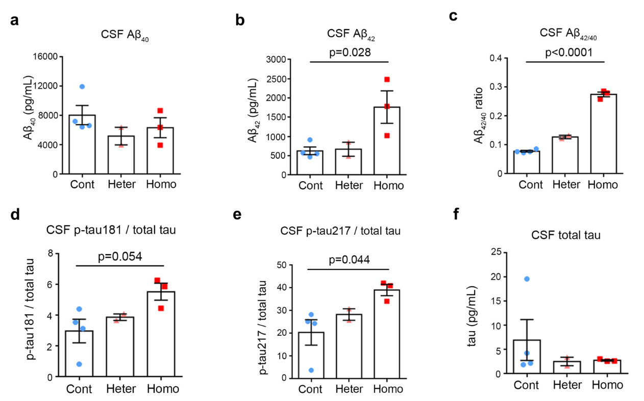 图1. PSEN1突变猴脑脊液中AD相关生物标志物的变化