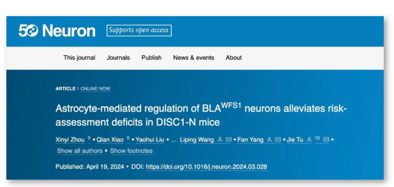 2024年4月19日,中国科学院深圳先进技术研究院脑认知与脑疾病研究所(以下简称“脑所”)/深港脑科学创新研究院屠洁研究员团队在Cell Press(细胞出版社)期刊Neuron杂志上发表了题为“Astrocyte-mediated regulation of BLAWFS1 neurons alleviates risk-assessment deficits in DISC1-N mice”的研究论文。