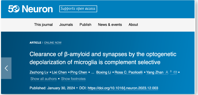 北京时间1月30日,中国科学院深圳先进技术研究院脑认知与脑疾病研究所/深港脑科学创新研究院詹阳研究员团队在Neuron杂志在线发表题为Clearance of β-amyloid and synapses by optogenetic depolarization of microglia is complement selective 研究论文。