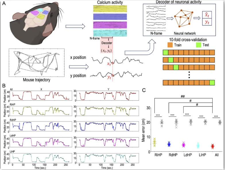 在实际应用中,研究人员对小鼠海马的四个亚区(左右背侧和左右中间部位海马)的神经元进行钙浓度指示蛋白GCaMP6s标记并利用TINIscope进行四脑区同步成像。通过定量的行为分析,佩戴四个设备并没有对小鼠的自由活动产生明显影响。研究人员分别在T迷宫和旷场环境中记录了小鼠四个海马亚区的神经元活动,并发现了约25%的神经元亚群具有空间调制特性。此外,研究人员还训练了机器学习模型,对记录的神经活动进行解码得到小鼠的空间位置,验证了设备采集到数据的可靠性。
