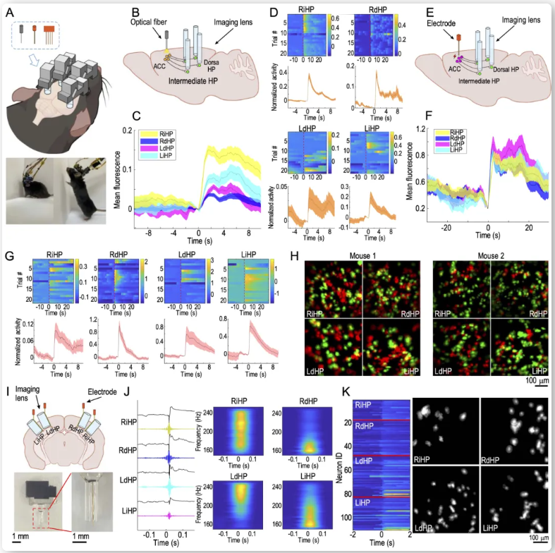 TINIscope的尺寸和重量优势使其与其他方法相结合变得更加容易。研究人员在四个海马亚区同步记录的实验基础上,还在扣带回进行光遗传或电生理刺激,并记录到了对刺激有响应的神经活动。此外,研究人员还结合了电生理记录技术,在四个钙成像区域附近,同步记录其局部场电位活动,并从中检测到了尖波涟漪(Ripple)放电。