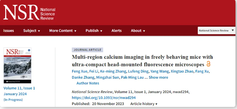 2024年1月29日,中国科学技术大学、中国科学院深圳先进技术研究院脑疾病与脑认知研究所/深港脑科学创新研究院毕国强课题组和深圳理工大学(筹)周鹏程课题组合作在National Science Review 杂志在线发表名为“Multi-region calcium imaging in freely behaving mice with ultra-compact head-mounted fluorescence microscopes”的工作。