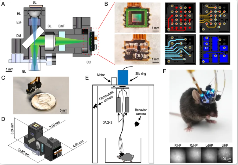 该工作直接面向多脑区同步记录的需求,通过系统优化光学、电子学和机械方面的设计,开发了目前世界上最轻的(0.43克)的超紧凑头戴式荧光显微镜——TINIscope,并在自由活动的小鼠上实现了对四个海马亚区神经元钙活动的同步成像。TINIscope为神经科学家提供了一种新的重要研究手段,用于探索动物在感知、认知和行为等方面的神经元级别的跨脑区协调作用。