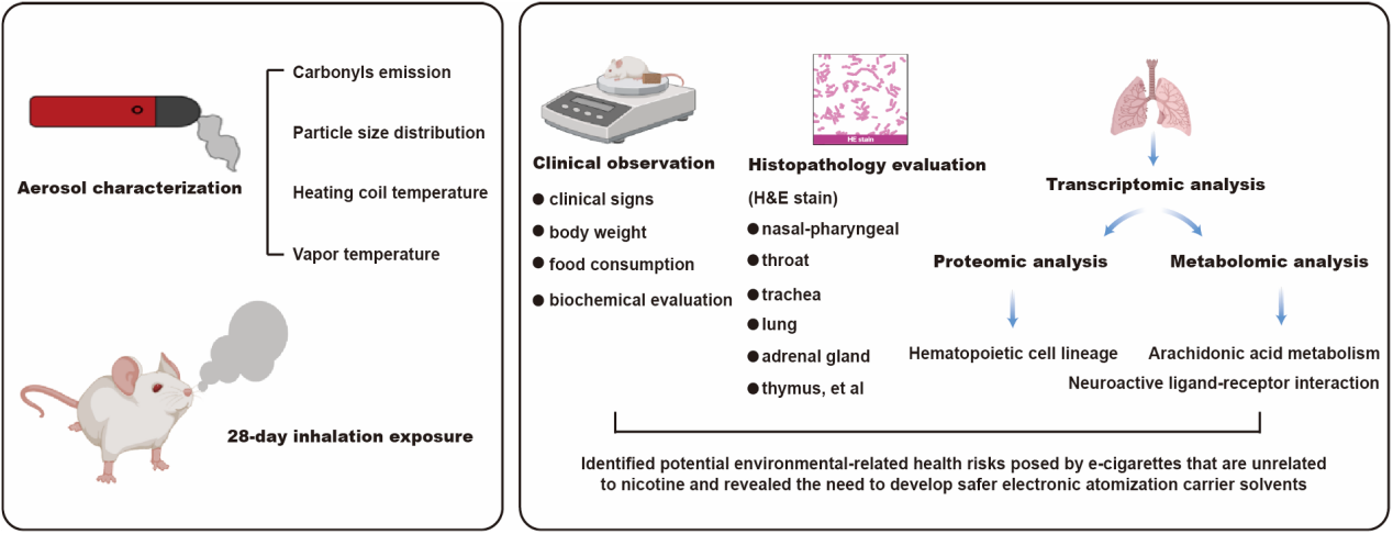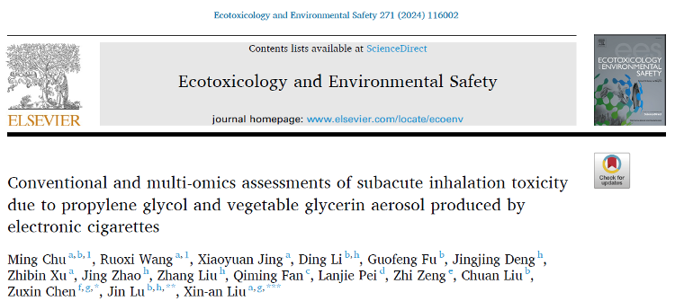 中国科学院深圳先进技术研究院脑认知与脑疾病研究所/深港脑科学创新研究院刘欣安课题组和陈祖昕课题组于2024年1月26日在Ecotoxicology and Environmental Safety上在线发表了题为“Conventional and Multi-omics Assessments of Subacute Inhalation Toxicity Due to Propylene Glycol and Vegetable Glycerin Aerosol Produced by Electronic Cigarettes”的研究论文。研究团队通过传统吸入毒理的研究方法结合前沿多组学关联分析,在动物模型上深入研究了电子雾化常用载体溶剂PG/VG本身的毒性及作用机制。