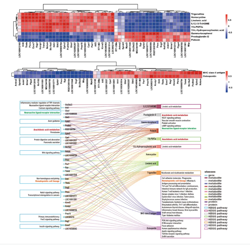 接着,课题组结合包括转录组学、蛋白质组学和代谢组学的多组学方法,评估对肺部基因、细胞和组织的潜在毒理效应。结果显示,PG/VG暴露组和空气组相比,共检测出110个差异表达基因(DEGs);6365种差异蛋白质,包括显著上调23个,显著下调64个;代谢组分析筛选出62种差异代谢物。其中,上调的代谢物48种,下调代谢物14种。富集的KEGG通路包括病毒感染、吞噬体、细胞因子和免疫网络。为鉴定潜在的分子改变,将PG/VG气溶胶暴露后肺部基因及蛋白表达的变化和代谢物改变进行关联分析的桑基图显示,在差异基因和差异代谢物之间的关联中,GIra1基因和代谢产物前列腺素I2都参与了神经活性配体-受体相互作用通路;相关基因Ephx2和代谢产物前列腺素I2均参与了花生四烯酸的代谢途径;Ephx2基因及其代谢物11b-PGF2a也被检测到与花生四烯酸代谢途径相关。在差异基因与差异蛋白的关联分析中,Dntt基因与MHC class II类抗原均参与造血细胞谱系代谢途径。因此,PG/VG气溶胶暴露可能通过上述途径影响肺组织相关分子的变化。