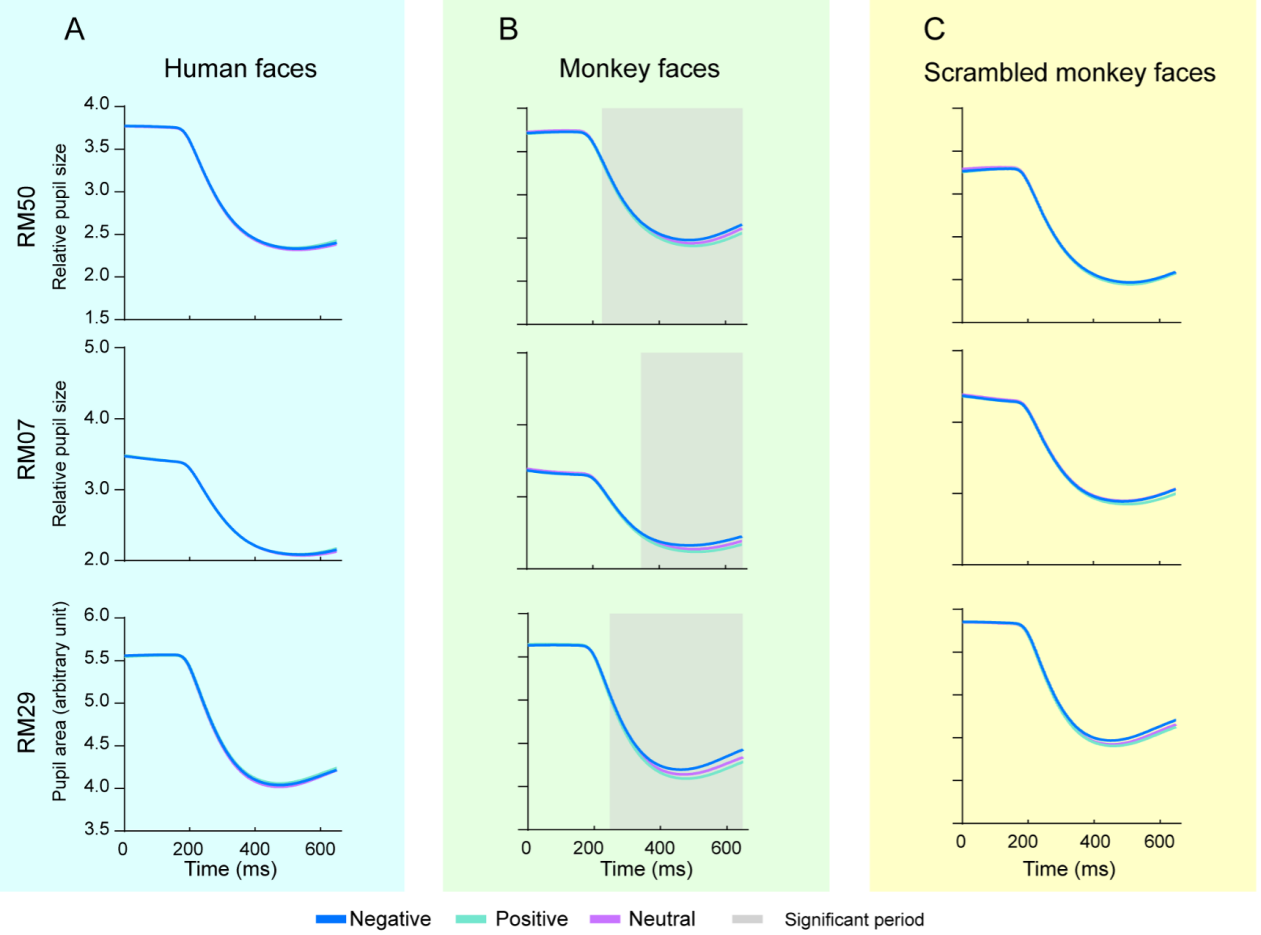 由于瞳孔是反映猕猴内在状态的一个指标,研究人员同时还追踪了猕猴注视情绪面孔时瞳孔大小的变化。研究结果显示,猕猴在注视不同情绪的人类面孔时其瞳孔收缩并无差异(图3A);而注视同类的负性情绪面孔后其瞳孔收缩程度显著小于注视中性面孔和正性面孔(图3B中灰色部分显示了出现显著差异的时间段)。将猴类的情绪面孔碎片化以消除其情绪差异后,该效应也随之消失(图3C)。该结果表明猕猴瞳孔收缩程度的差异是由猕猴的情绪面孔所传递的情绪信息引起的。这一结果也支持猕猴对同类的情绪面孔更敏感的结论。