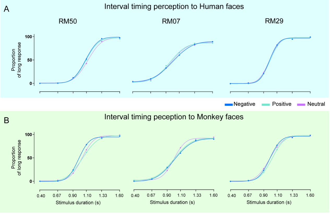 图2. 猕猴对人类和猴类情绪面孔的时间知觉曲线