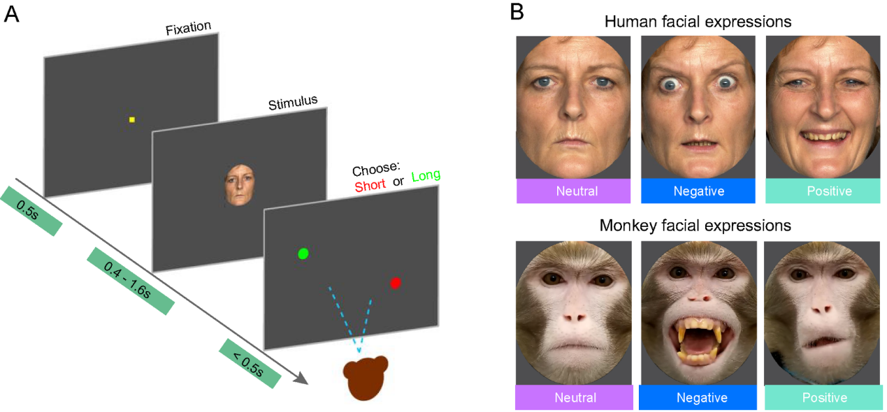 图1. 时间知觉的行为任务范式(A)以及用做视觉刺激的人类/猴类情绪面孔(B)