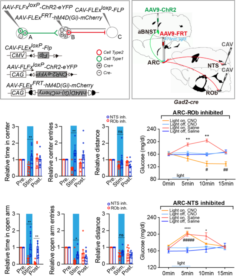 2022年11月8日,王立平团队在 Cell Reports 上发表题为Divergent neurocircuitry dissociates two components of the stress response, glucose mobilization and anxiety-like behavior的研究成果,揭示了aBNSTGad2+→ARCGad2+的环路分别通过投射到中缝隐核(The Raphe obscurus nucleus,ROb)和孤束核(The nucleus of solitary tract,NTS)协调血糖变化和焦虑样行为输出。