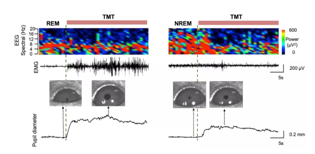 本研究使用自主研发的小动物眼动监测方法结合脑电肌电记录,发现相较于NREM睡眠,REM睡眠期间给予天敌气味能够更快唤醒小鼠,且醒来后唤醒程度更高,这提示REM睡眠可能扮演着睡眠中“哨兵”的角色,用以快速感知环境中可能的威胁。不只以一种全新的方式来理解大脑在维持生命体适应环境的重要角色,也为睡眠障碍及本能恐惧失调相关精神疾病共患病的诊断与治疗提供了可能的靶点。
