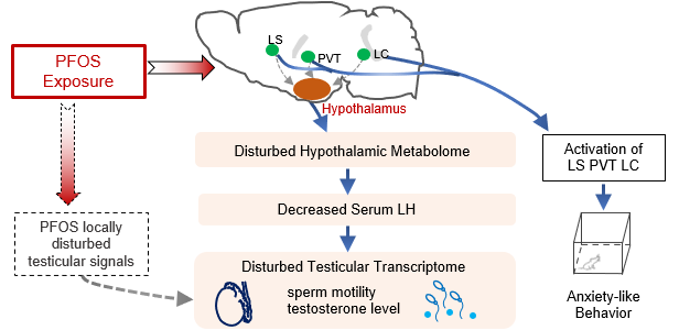 研究团队在神经生物学、生殖内分泌与环境毒理学的交叉领域,针对全氟辛烷磺酸(PFOS)这一难降解有机污染物对男性生育力的破坏作用及机制展开合作研究,发现PFOS暴露会导致下丘脑代谢通路紊乱,并通过下丘脑-垂体-睾丸轴影响生育力。此外,该研究也发现PFOS暴露激活了大脑中的蓝斑、丘脑室旁核及外侧隔核等压力应激相关核团,且伴随动物的焦虑样行为,提示其对负性情绪的影响值得更多关注。