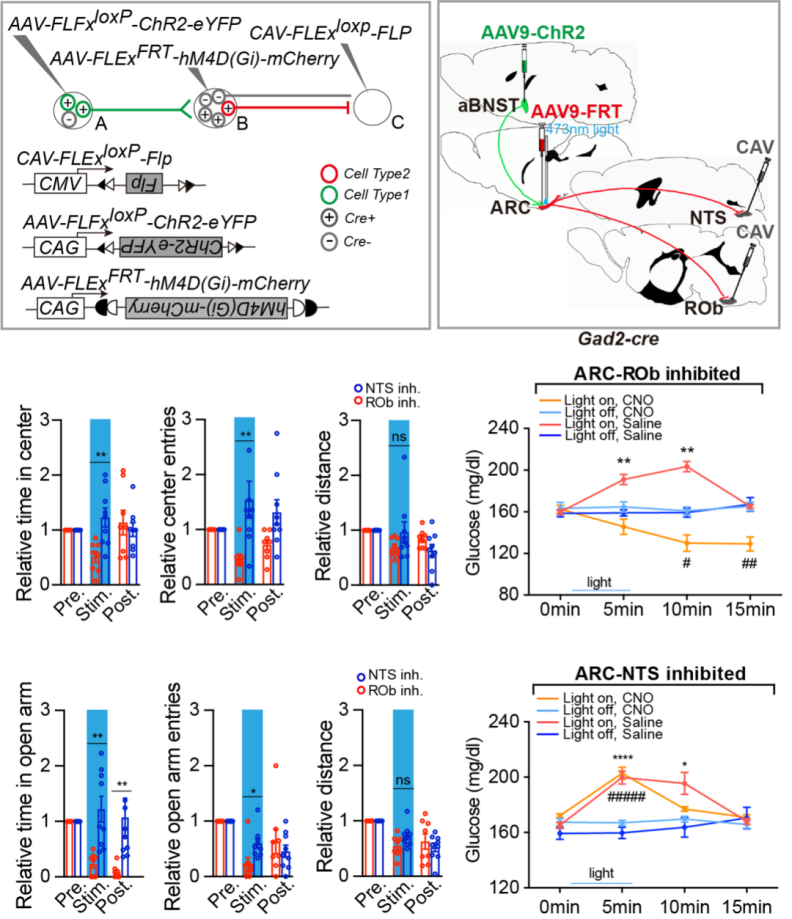 首先,研究人员利用光遗传学实验发现发现aBNST的GABA能神经元激活能诱导小鼠血糖上升,并且通过逆行示踪实验发现aBNST的GABA能神经元与ARC的GABA能神经元存在单级投射。通过光遗传学实验发现aBNSTGad2+→ARCGad2+环路激活在小鼠上可以诱导出焦虑样行为并产生血糖升高现象,并且在去除肾上腺后现象依然存在;光遗传抑制这条通路可逆转束缚压力应激造成的血糖上升,说明aBNSTGad2+→ARCGad2+环路在介导压力相关血糖上升中起着必要性作用。研究人员随后进一步通过顺逆行神经环路示踪方法发现位于延髓的NTS和ROb与ARC存在环路连接,利用三级环路调控技术,发现NTS是aBNSTGad2+→ARCGad2+环路激活产生焦虑样行为的必要下游,而ROb则是产生血糖上升反应的必要下游。