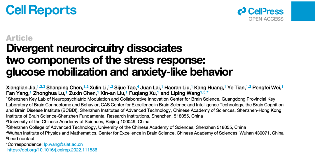 Cell Reports | 中科院深圳先进院王立平团队发现大脑“平行处理”压力应激导致焦虑行为与血糖升高的神经环路