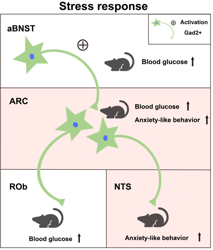 近日,中国科学院深圳先进技术研究院(简称“深圳先进院”)王立平团队在 Cell Reports 上发表题为“Divergent neurocircuitry dissociates two components of the stress response, glucose mobilization and anxiety-like behavior”的研究成果,揭示了aBNSTGad2+→ARCGad2+的环路分别通过投射到中缝隐核(The Raphe obscurus nucleus,ROb)和孤束核(The nucleus of solitary tract,NTS)协调血糖变化和焦虑样行为输出。