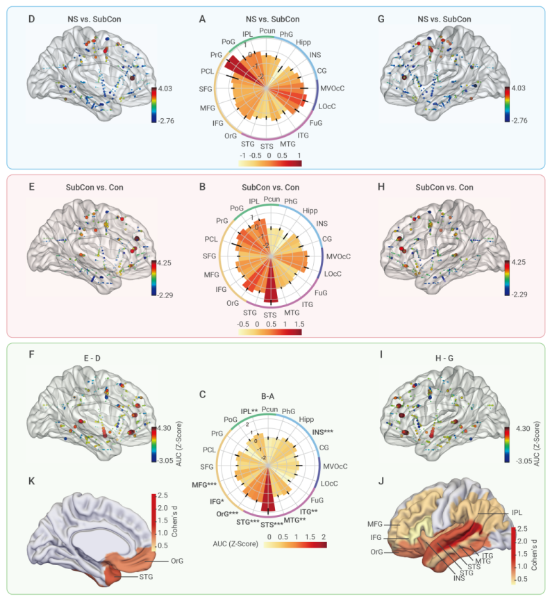 作者构建了基于机器学习的数据分析管道流(图7),利用随机森林模型训练决策树,获得了描述不同意识阶段iEEG信号差异的数值指针(AUC);再通过AUC去寻找哪些脑区在意识的转换过程中起主导作用。作者发现,在从无意识到意识下的转换中, 起主要作用的是额叶-顶叶联合区(如PrG)以及部分的颞叶/枕叶区(如LOcC);而在从意识下到意识上的转换过程中,主导的则是额叶区和颞叶区(如OrG、STS)(图8)。此外,在这两次状态转换中,有9个脑区的AUC值在第二次转换中显著高于第一次,表明这些脑区在意识的涌现过程中扮演关键作用,并且这些脑区在分布上形成了一个以颞上回/颞上沟(STG/STS)为中心的集群。