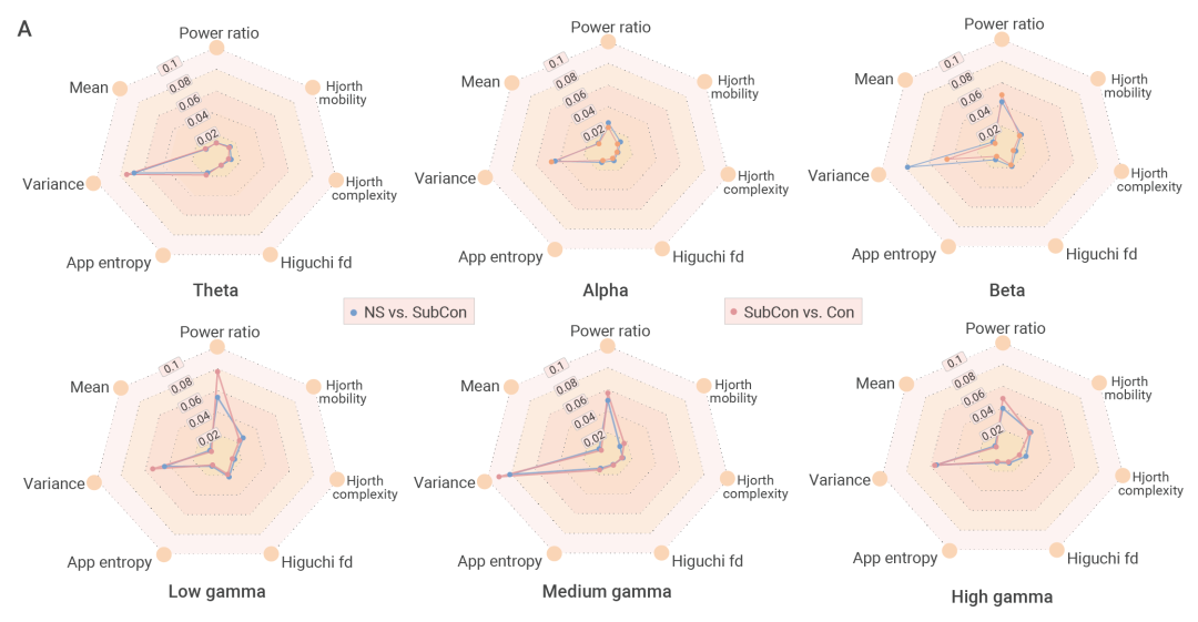 那iEEG信号中哪些特征与意识涌现最为相关呢?作者分析了信号中42个特征的权重,发现两组最为重要,即Power ratio(相对能谱功率)和Variance(方差)(图9)。这两组特征在所有频段信号以及两次意识状态转换中都展示了相对较高的特征重要性。作者推测,这些特征或许可以用作临床上检测意识状态的生理标记(Physiological marker)。