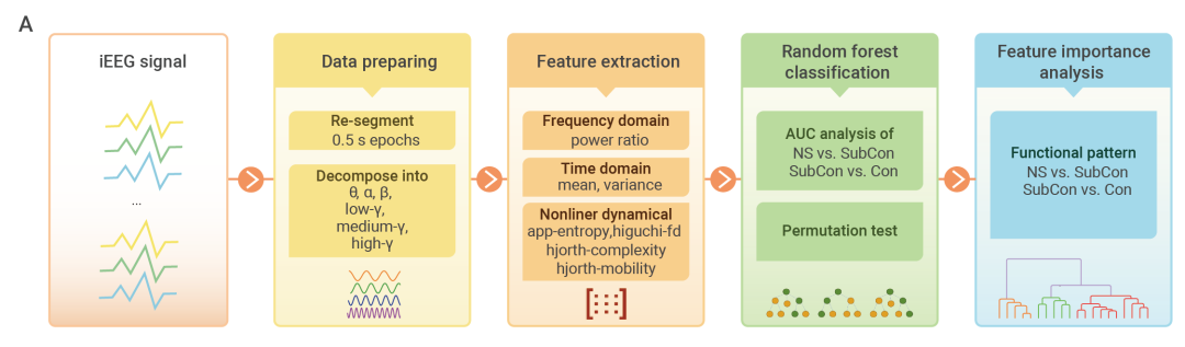 为了从海量的全脑尺度iEEG信号中发掘出导致不同意识状态转换的关键信息,同时避免先验假设的误导,作者引入了机器学习,通过数据驱动的方式来挖掘不同意识阶段的信号特征。