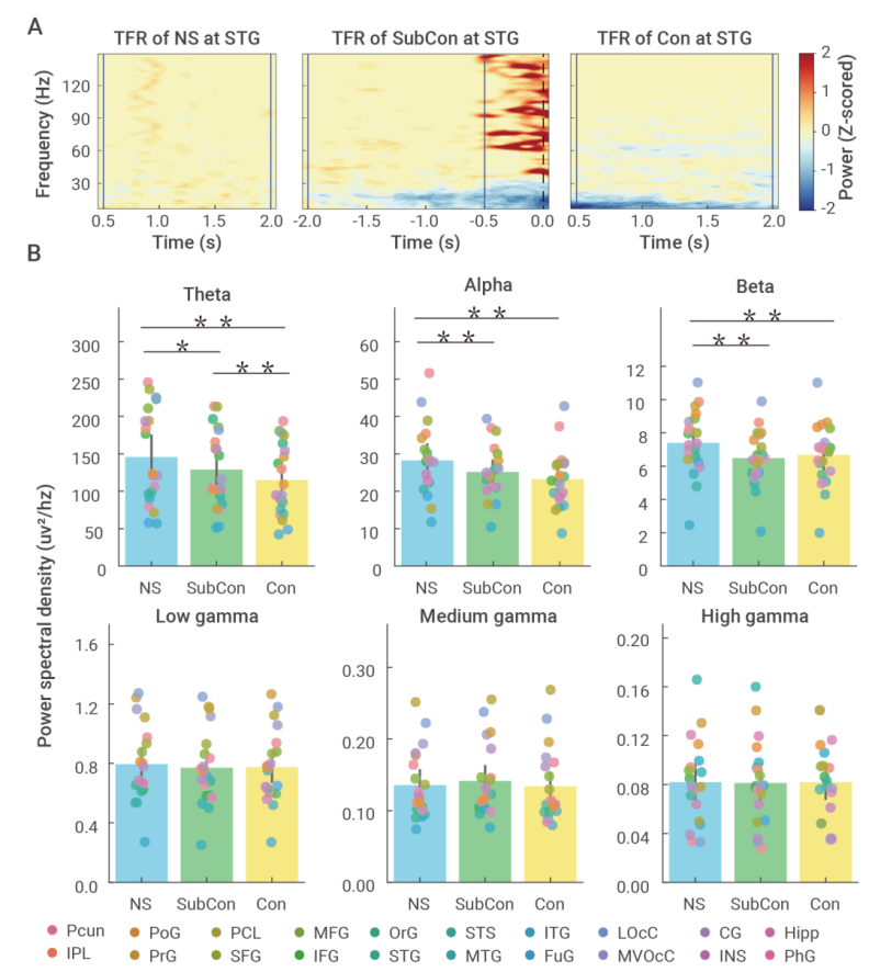 该工作首先采集受试者(均为因自身治疗需要而植入颅内电极的病人)在执行CFS任务时全脑尺度的iEEG信号,获得了大脑不同区域在无刺激状态(NS)、意识下状态(SubCon)以及意识上状态(Con)的神经电活动数据。通过定量化分析展示了iEEG信号在不同意识阶段的信号特征,包括时频特点、不同频段的能量变化规律等(图5)。