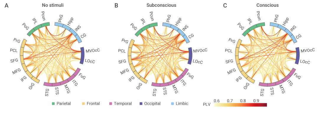 作者发现,在从无刺激到意识下转换的过程中,全脑的功能连接(FC)强度是增强的;而从意识下到意识上的转换则是减弱的。这表明,大脑在形成感知意识的过程中,需要增强全脑的同步性;而在意识已经形成之后,就不需要再维持全脑的高同步性(图6)。