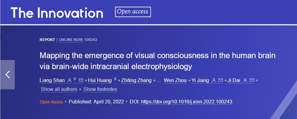 Shan, L., Huang, H., Zhang, Z., Wang, Y., Gu, F., Lu, M., Zhou, W., Jiang, Y., Dai, J., Mapping the emergence of visual consciousness in the human brain via brain-wide intracranial electrophysiology, The Innovation (2022), doi: https://doi.org/10.1016/j.xinn.2022.100243.