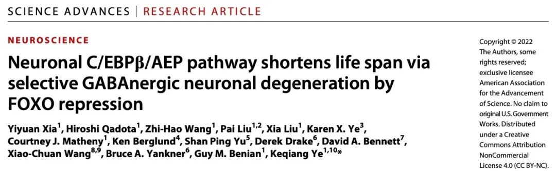 北京时间3月31日,中国科学院深圳理工大学(暂定名,简称“深理工”)讲席教授(前美国埃默里大学终身教授)叶克强博士团队在《科学进展》(Science Advances)杂志上发表题为Neuronal C/EBPβ/AEP pathway shortens life span via selective GABAnergic neuronal degeneration by FOXO repression的文章,团队在以往的研究理论基础上,提出阿尔兹海默症与人的预期寿命均受大脑中的“C/EBPβ/AEP”神经信号通路影响。C/EBPβ是众所周知的调节营养代谢、能量稳态和脂肪分化的转录因子。它可能在决定寿命长短中发挥作用。值得注意的是,C/EBPβ介导了多种与年龄相关的基因,并且其表达水平在老化的神经细胞中急剧升高。