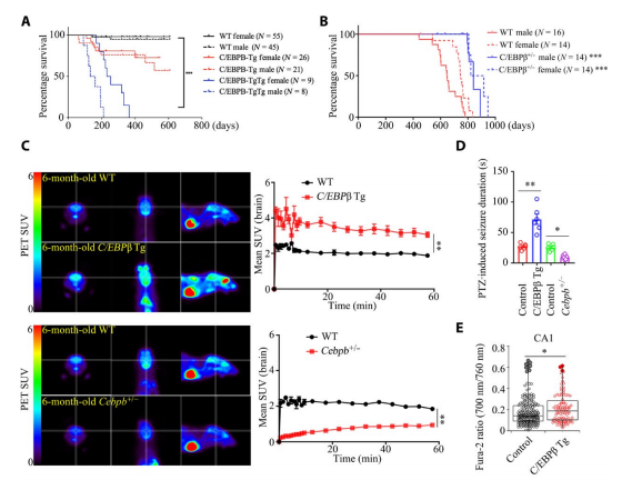 图1.神经细胞中C/EBPβ升高引起神经兴奋,缩短小鼠生命周期
