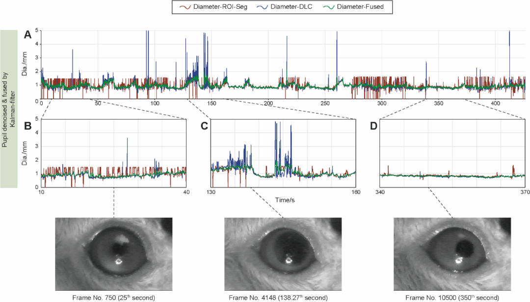 最后,为了准确追踪瞳孔特征,研究人员对比了目前常用的瞳孔提取算法,采用优势互补的方法,通过设计自适应融合算法,将传统的图像分割算法与基于机器学习的方法相结合。克服了光照复杂、动物眼球运动范围大、眨眼增加等噪声问题。眼动追踪系统的这些优势将促进研究人员结合和同步神经记录和操作,从而全面解释大脑认知的机制。