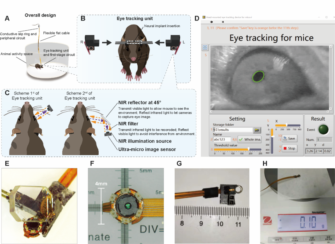 首先,团队自主设计并研发了目前全世界最轻便的超微型的眼动追踪设备。在头戴端,只保留了必要的图像传感器及光学元件,其他的外围电路设计在了远端。从而极大地减轻了头部负载(只有0.1g)和设备尺寸,让动物负载更多的其他设备。其次,设备采用了可拆卸而非集成化的设计,在非实验期间,可以拆掉眼动追踪单元,方便动物在笼内活动;而在实验时,可以快速安装,并将颅骨暴露出来,方便其他设备植入。