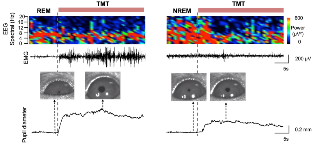 王立平团队使用自主研发的小动物眼动监测方法结合脑电肌电记录,发现相较于NREM睡眠,REM睡眠期间给予天敌气味能够更快唤醒小鼠,且醒来后唤醒程度更高,这提示REM睡眠可能扮演着睡眠中“哨兵”的角色,用以快速感知环境中可能的威胁(图1)。