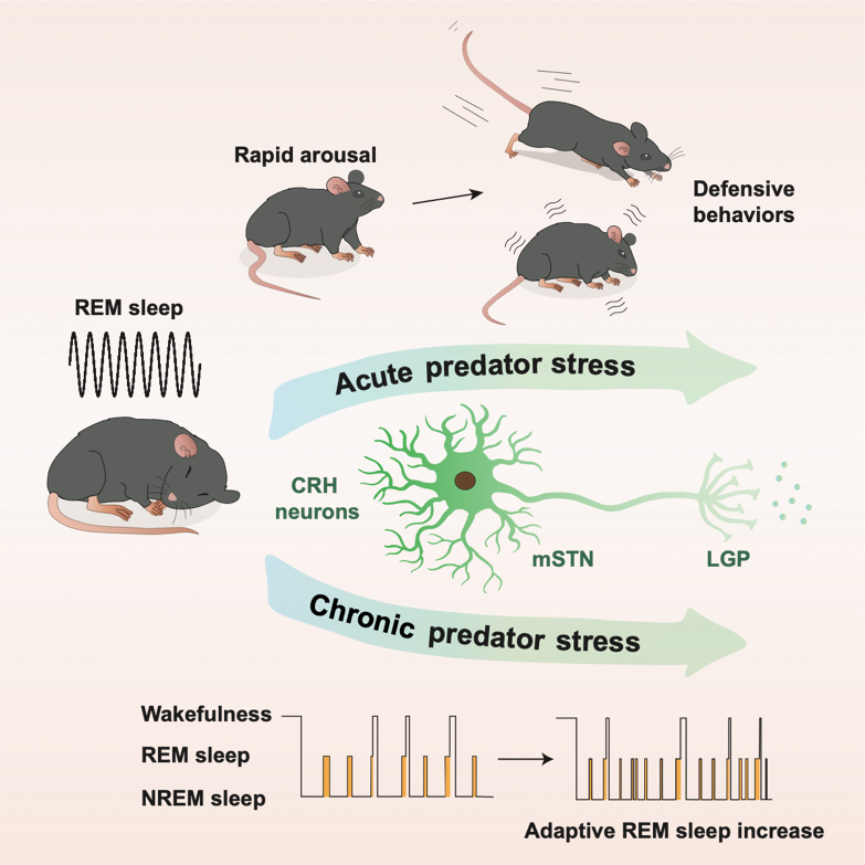 在此研究中,研究团队综合使用光纤记录,光/药物遗传学调控及内窥镜单神经元成像,解析了一条从丘脑底核(medial subthalamus nucleus, mSTN)促肾上腺皮质激素释放激素(corticotropin releasing hormone , CRH)神经元投射到外侧苍白球(lateral globus pallidus, LGP)的神经环路,介导了快速眼动睡眠下对天敌刺激的响应,抑制这群神经元缩短了快速眼动睡眠的长度,但延长了天敌刺激诱发觉醒的潜伏期。在动物觉醒情况下,这群神经元同样参与对本能恐惧刺激的调节。此外,通过给予小鼠慢性天敌压力刺激,发现小鼠REM睡眠结构显著改变,表现为REM睡眠时间的延长和睡眠的片段化,但在压力刺激期间化学抑制mSTN-CRH神经元活性则减弱了小鼠REM睡眠结构的改变。