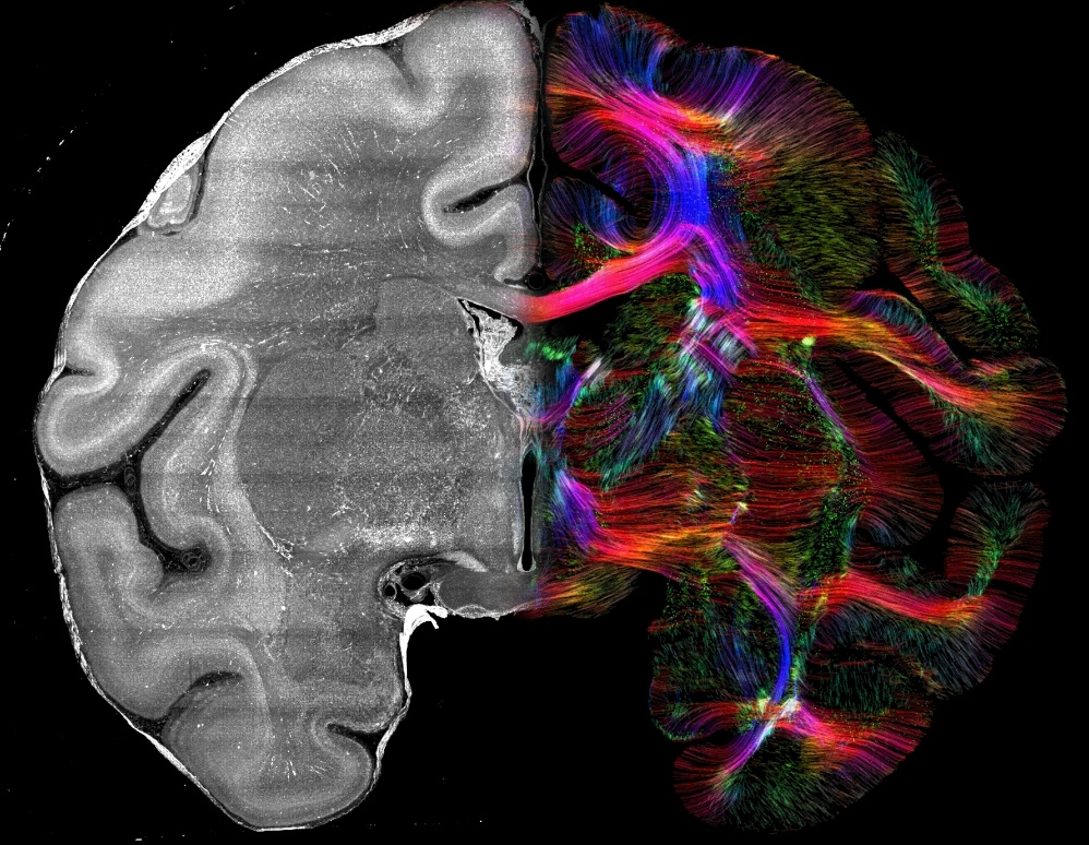 图2. 左侧是尼氏染色的猕猴脑切片,右侧是尼氏染色经过CABLE计算得到的纤维图像(颜色编码表示不同方向:红色代表左右向,绿色代表前后向,蓝色代表上下向)