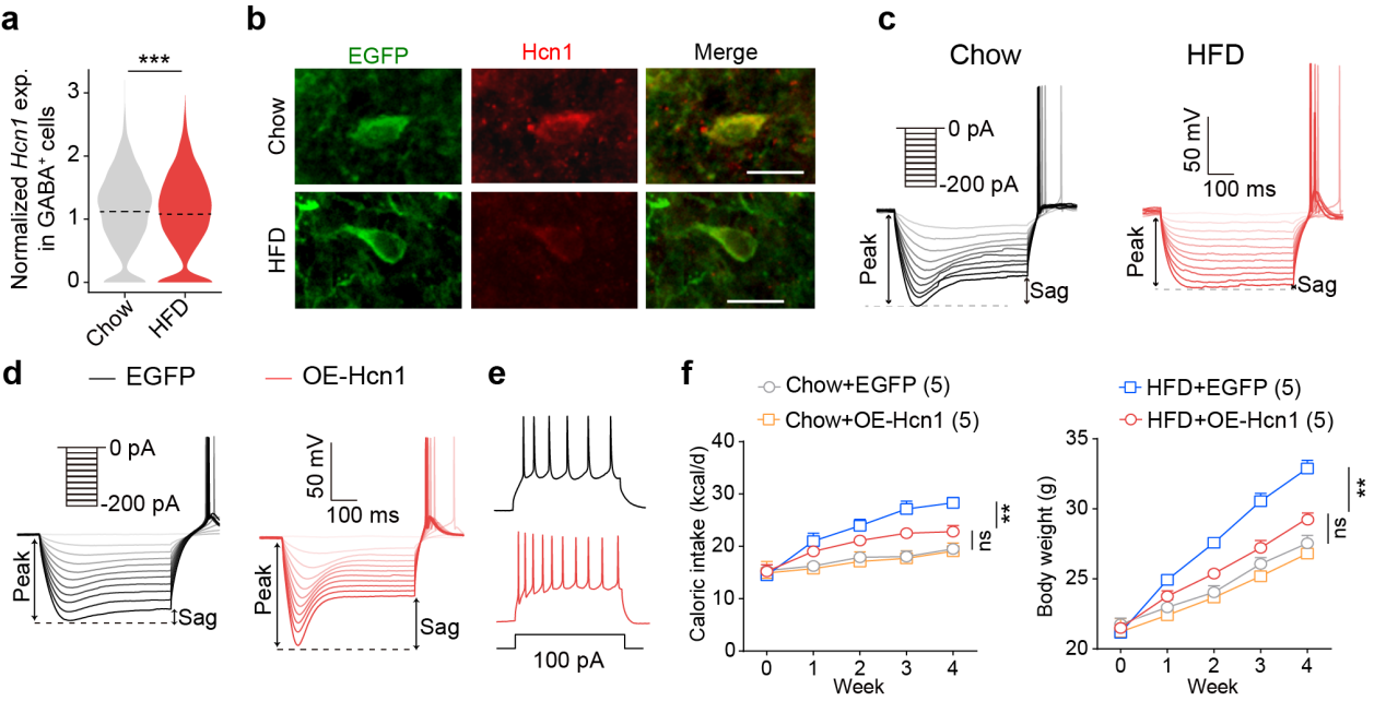 随后,通过单细胞钙成像及膜片钳记录,团队证实肥胖小鼠外侧隔核神经元的兴奋性发生下调。进一步研究发现,Hcn1基因的下调是导致神经元“活性下降”的重要原因。而如果重新提高该基因的表达,就能有效抑制高脂饮食引发的小鼠暴食行为,从而消除肥胖的发生。有意思的是,这种干预并不影响小鼠对普通食物的正常进食。