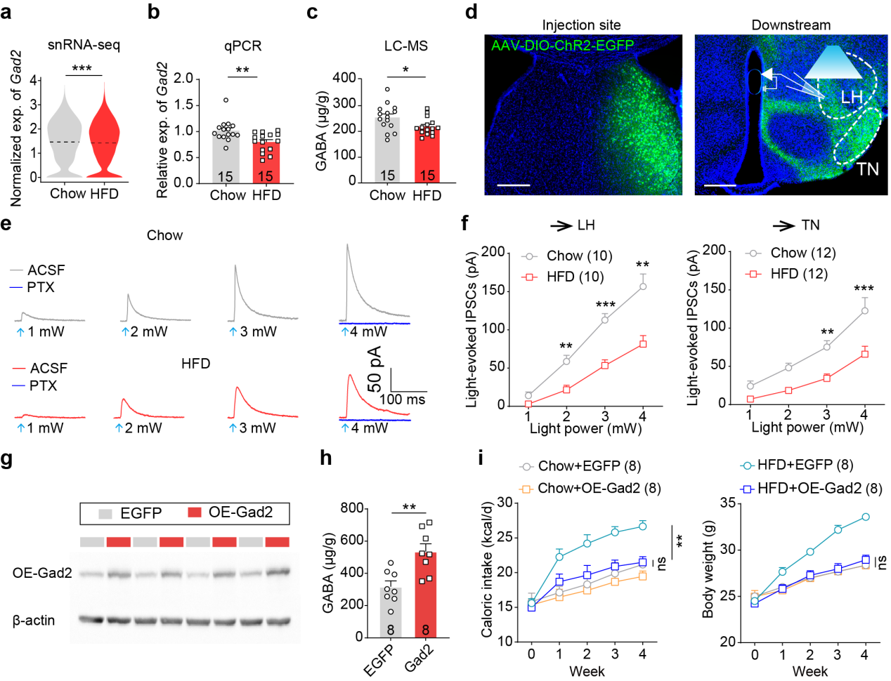 图3. Gad2通过调节LSGABA神经元对下游的抑制能力干预高脂饮食引发的肥胖进程