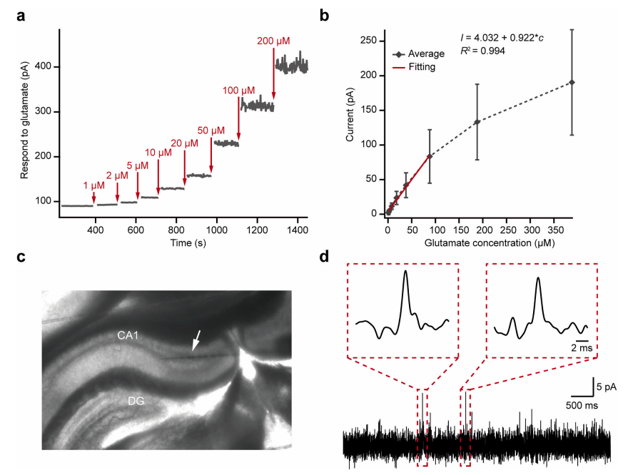 通过体外电化学实验,团队证实该新型超快谷氨酸传感器对谷氨酸具有高灵敏度(检测限0.1μM)、宽线性范围(1-100μM)和良好的稳定性,标准响应时间仅约100ms,可实现20kHz采样频率。并在小鼠离体脑片上,成功记录到了海马CA1区域内的量子化谷氨酸释放信号(单峰信号),证实技术应用的可行性。