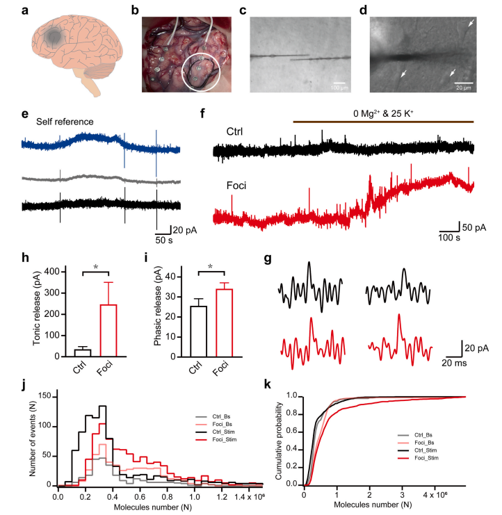 癫痫,作为最普遍的神经系统疾病之一,影响着全球约5200万人,造成沉重的社会与经济负担。癫痫的发病与致病灶内兴奋性/抑制性突触传递的功能失衡密切相关。虽然已知癫痫发作时细胞外谷氨酸浓度升高,但传统检测方法(如微透析)时间分辨率低(分钟级),无法捕捉到突触传递的基础——亚毫秒级的量子化释放。因此,表征患者癫痫致病灶内的量子化谷氨酸释放的病理特性,对于阐明人类大脑中癫痫发作的机制具有重要意义。