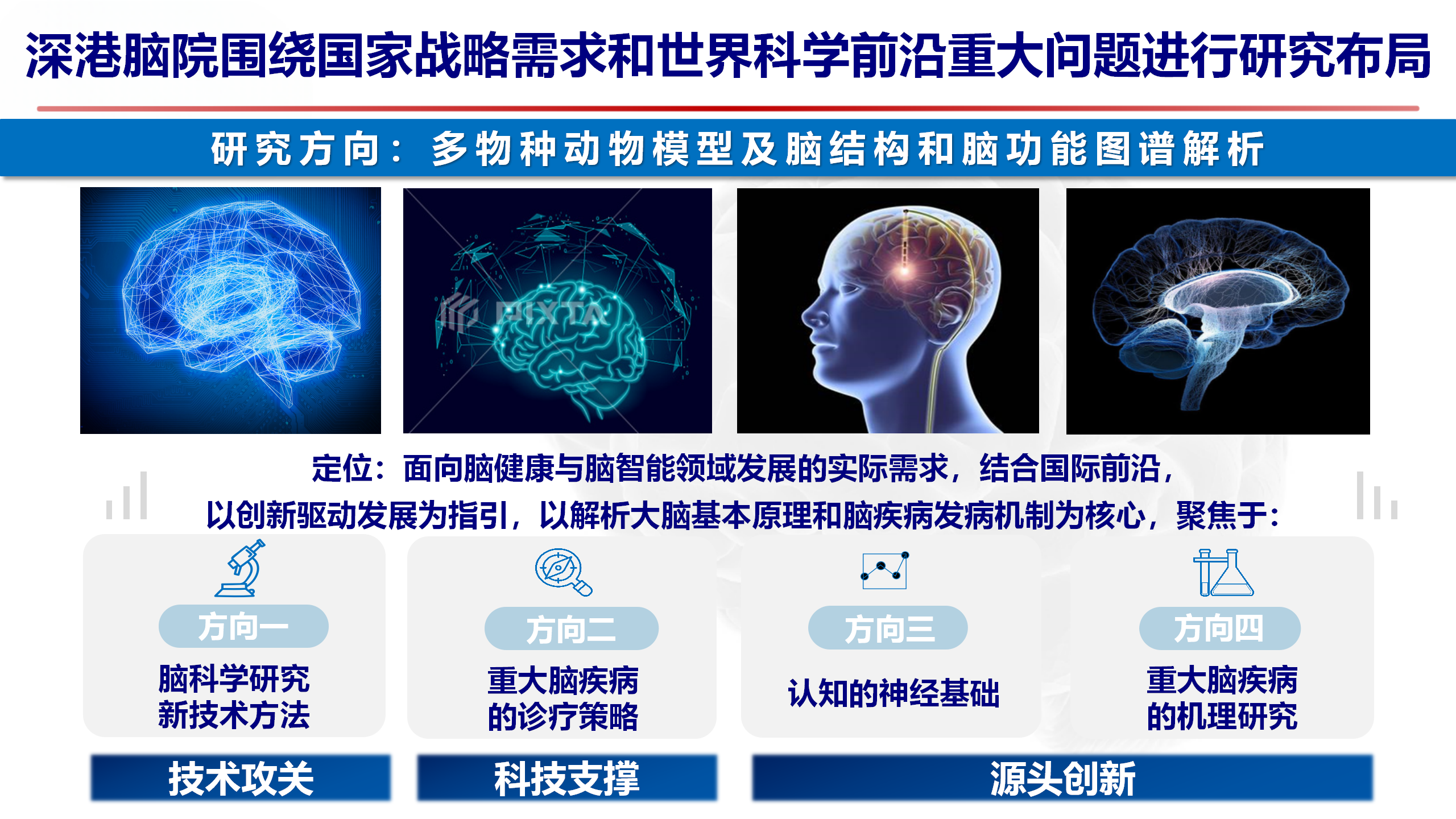 深港脑院重点布局了“认知的神经基础”、“重大脑疾病机理”、“重大脑疾病诊疗策略”和“脑科学研究新技术方法”四个研究方向,后在建设期进一步凝练形成了以解析大脑基本原理和脑疾病发病机制为核心目标,以多物种动物模型及脑结构和脑功能图谱解析建设为核心的研究方向。